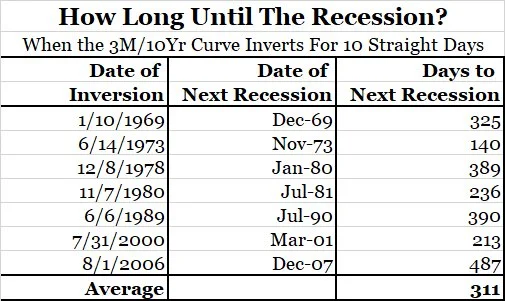 Per @biancoresearch the 10-year/3-month curve has inverted for 10 consecutive days or more 6 times in the last 50 years. On each of those occasions, a recession has followed (on average 311 days later).