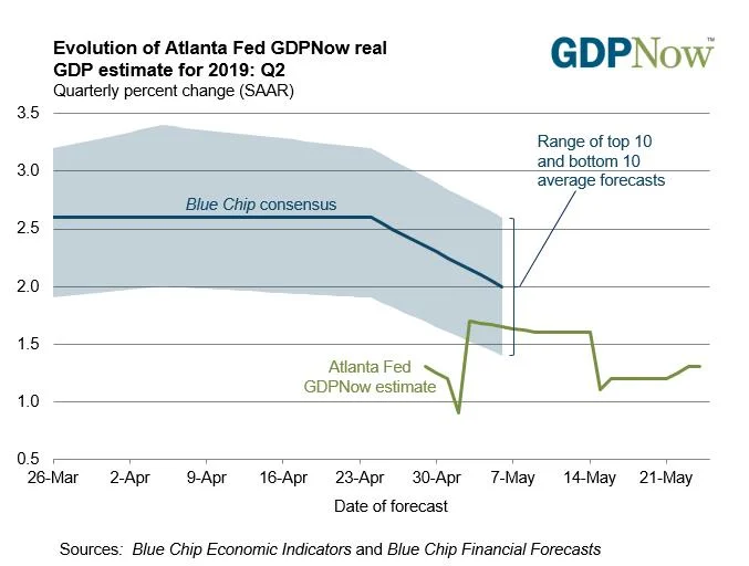 Well, guess what—our 45-piece economic data index has tanked as well. The Atlanta Fed’s GDPNow model estimate for real GDP growth (seasonally adjusted annual rate) in the second quarter of 2019 is 1.3 percent on May 24, up from 1.2 percent on May 16. After the U.S. Census Bureau's releases on new home sales and construction costs on Thursday, May 23, the nowcast of second-quarter real residential investment growth increased from -4.0 percent to -1.6 percent.