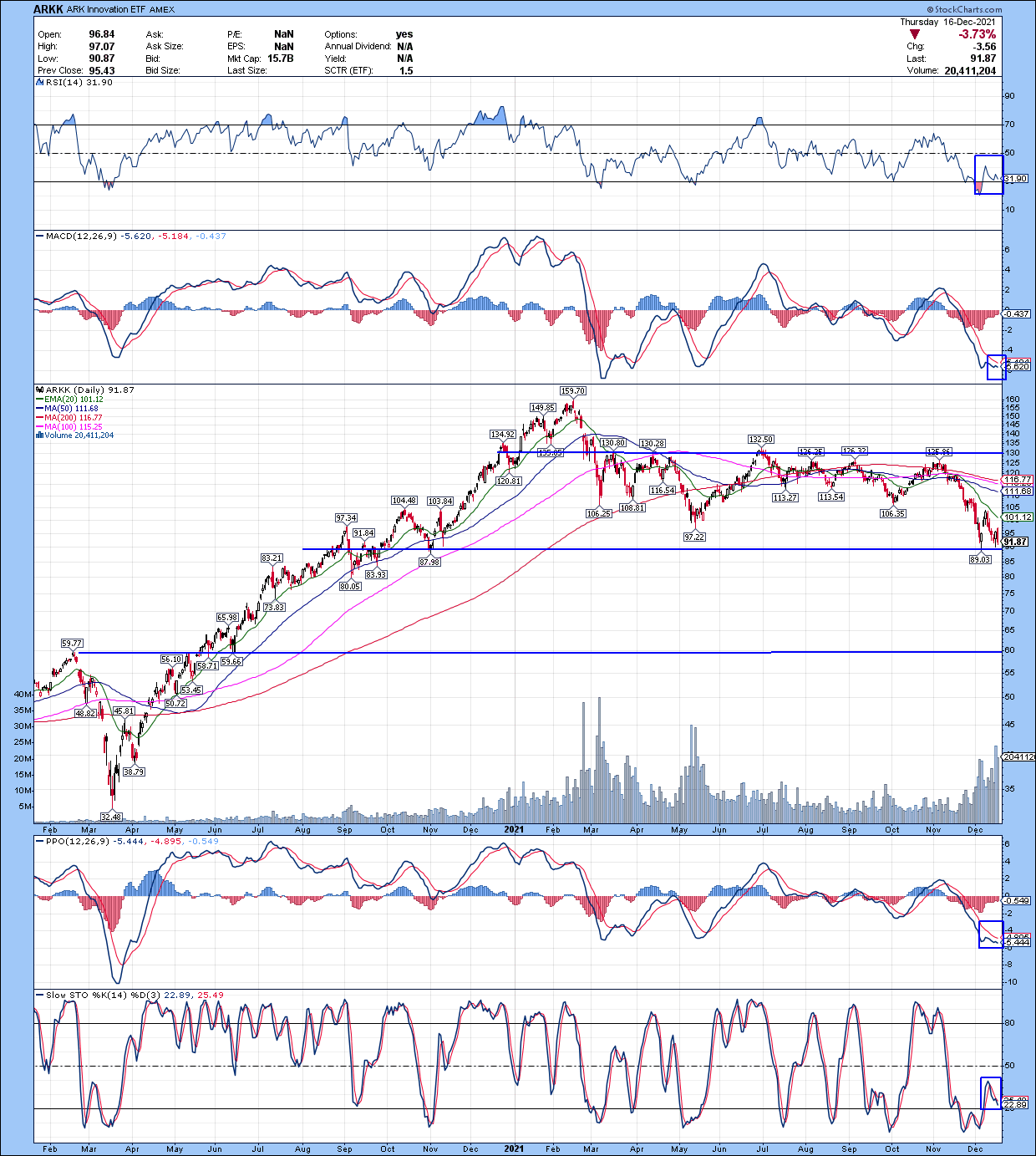 3) Take the POSTER Child and children of the last 12-24 month run of the 11-year bull market out (The ARKK Cathie Woods Disruptors) and shoot all the stocks in the fund/ETF. ARKK is now hanging on by a thread.