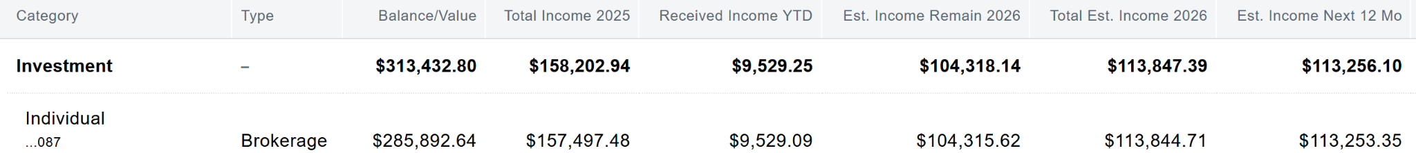 We also run our 6%-to-8% Per MONTH Income Portfolio — I call this portfolio “The OTHER Social Security” pension plan. Here is a $313,000 Ultra Monthly Income Account we manage for a retired friend of mine (this does not include $35,000 in 2025 she earned with a private placement secured note she holds outside this account).