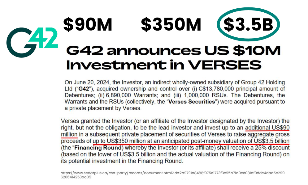You see, when Verses AI proves to the AI technology world that they have LEAPFROGED Open AI—which just closed another venture capital round at a $157 billion pre-money valuation—or simply the other private "Deep Learning" large language model generative AI companies which basically STEAL their digital content over the internet with an average $15 billion valuation, G42 is HEDGING its massive investment in Analog with the option to invest $90 million into Verses.